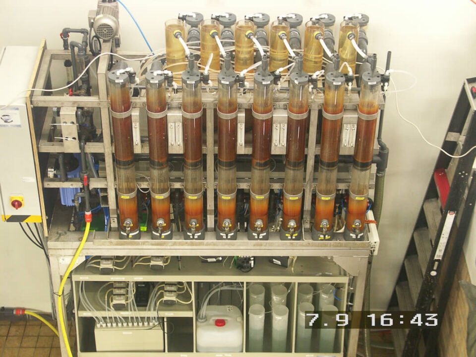 The central research question concerned the effect on nitrification of pre-oxidation of iron before filtration, i.e. whether iron ends up on the filter as (chemically formed) iron flakes or in dissolved, reduced form. A fully automatic test installation with 20 columns of my own design enabled me to simultaneously investigate six hypotheses for several months in parallel and of course in duplicate. Before the actual research at the groundwater purification of Oasen Lekkerkerk, I had tested the installation extensively and fully completed and evaluated all research protocols in a test hall of the TU Delft. Early 2009, the research at the groundwater location Lekkerkerk of Oasen started.